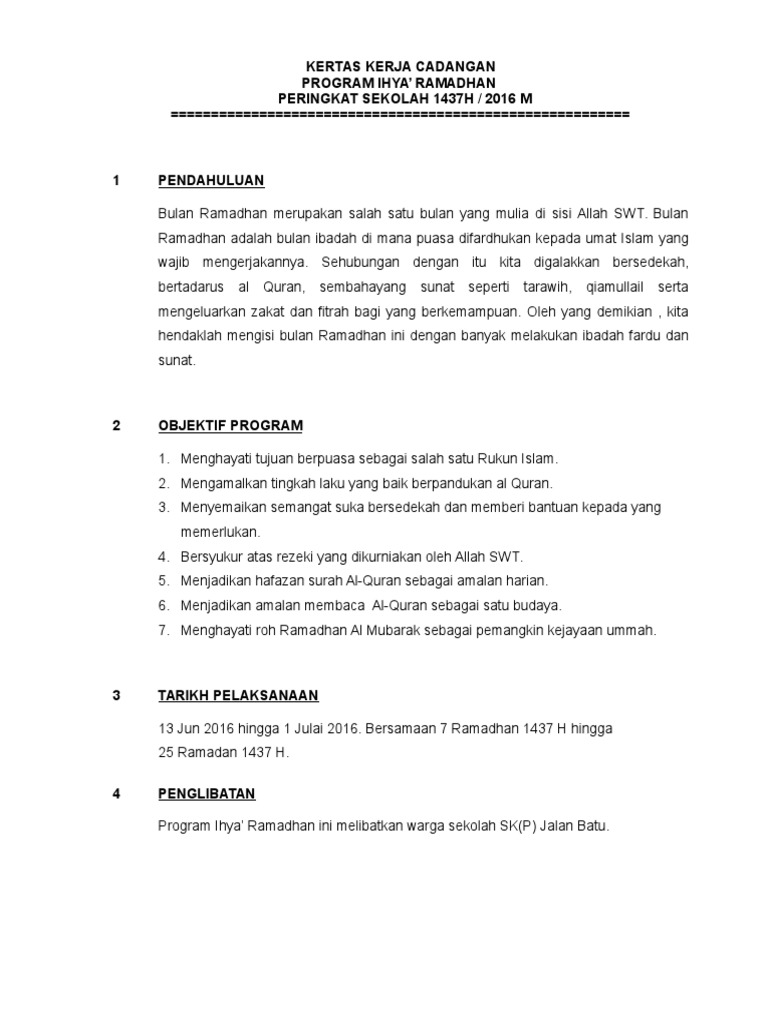 Kertas Kerja Ihya Ramadhan 2018 IKRAM18 Masa. 1100pagi 100 tengahari600 petang-1000 malam Tempat. Smk seri pantai kuala lumpur kertas kerja ihya ramadhan 1440h peringkat sekolah smk seri pantai anjuran panitia pendidikan islam dengan kerjasama persatuan al-falah 10.